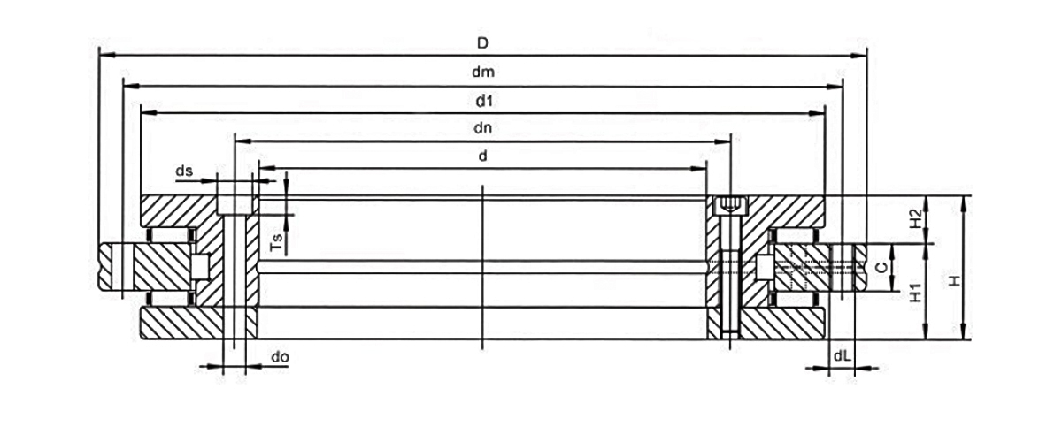 El cojinete giratorio de precisión YRT consta de un anillo de carcasa radial/de empuje, un anillo de eje radial/de empuje, una arandela de empuje, dos conjuntos de jaula de rodillos de agujas y un conjunto de rodillos cilíndricos radiales. El anillo de la carcasa y el anillo del eje tienen orificios para tornillos de montaje distribuidos uniformemente. Este tipo de rodamiento presenta una alta capacidad de carga axial y radial, alta rigidez y muy alta precisión.